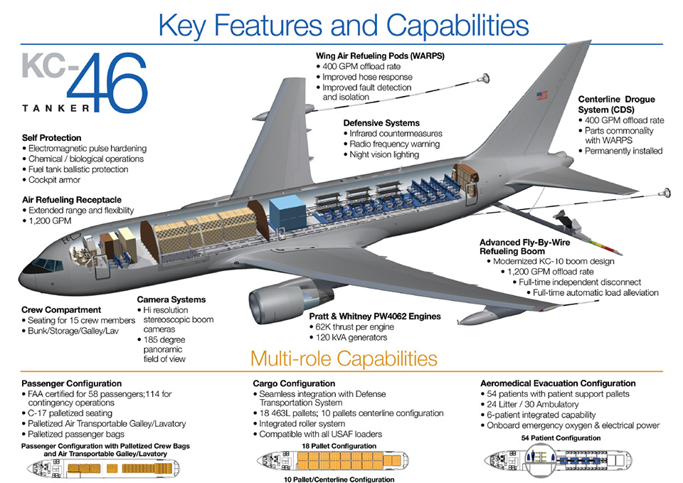 The KC-46A boasts a fly-by-wire boom with independent disconnect and automatic load alleviation as well as both centerline and wing-mounted hose and drogue systems.